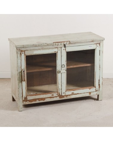 Meuble de rangement porte coulissante. 1 porte Buffet vitrine en bois massif patiné vert d'eau. Pièce unique pour le salon ou la chambre. Intérieur style bois naturel 1 étagère pour 2 espaces de rangement. Moulures sur le haut du meuble